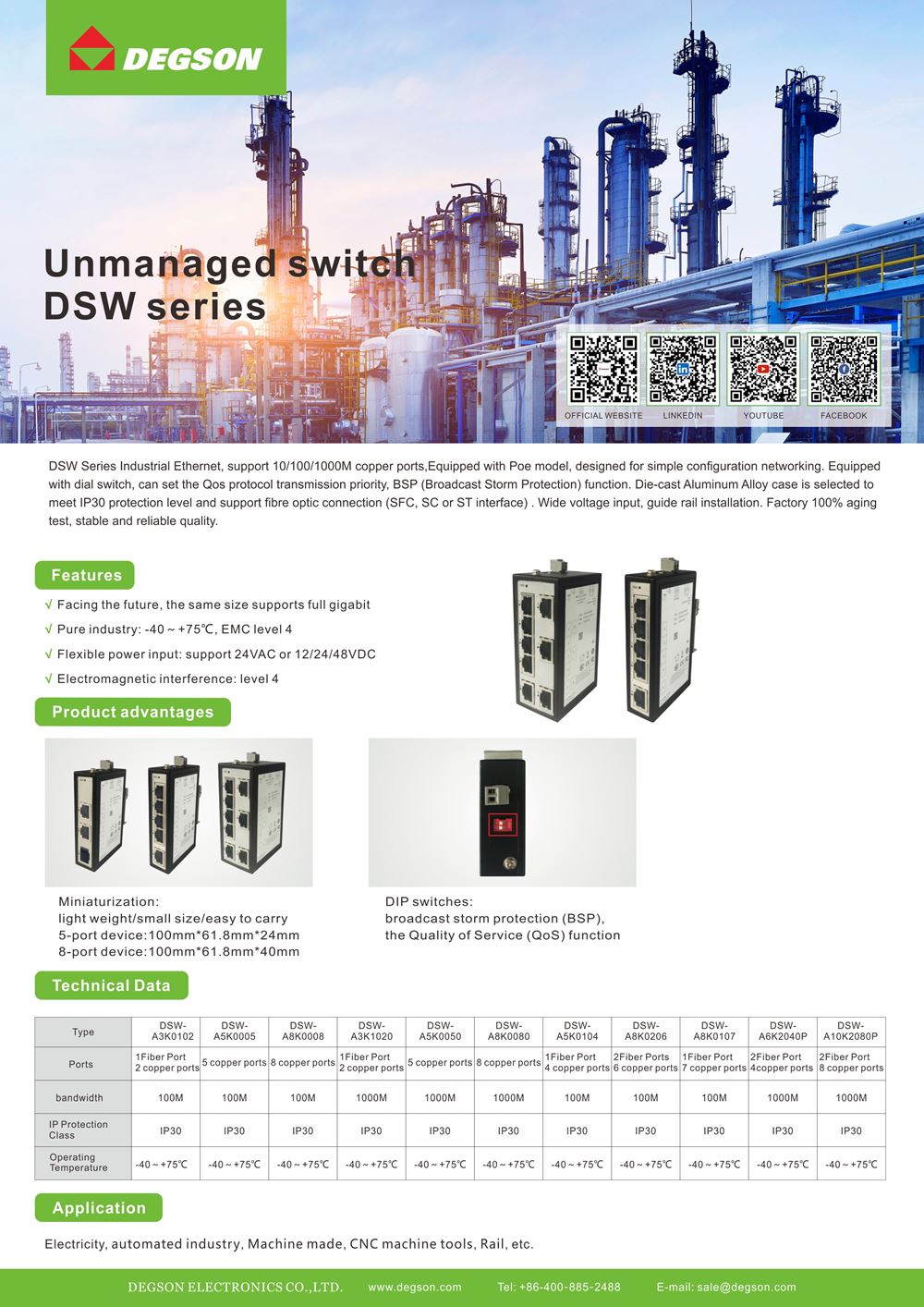 Промышленный Ethernet серии DSW, поддержка медных портов 10/100/1000 Мбит/с. Представлен моделью с POE, предназначенной для простой настройки сети. Оснащен переключателем, который может установить приоритет передачи протокола: Qos, функцию BSP (Broadcast Storm Protection). Литой под давлением корпус из алюминиевого сплава соответствует уровню защиты IP30 и поддерживает оптоволоконное соединение (интерфейс SFC, SC или ST). Широкий вход напряжения, установка направляющей. Заводские испытания на старение 100%, стабильное и надежное качество.